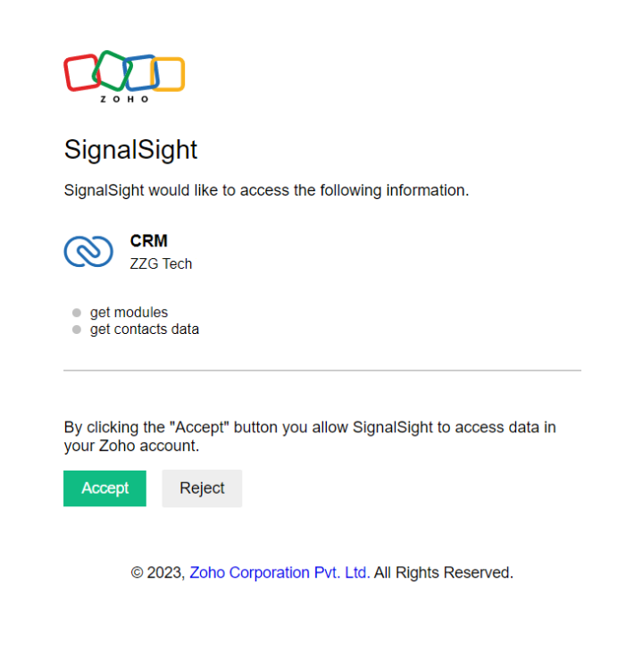 When you click the Zoho Login button, a popup window will appear where you need to log in to your desired Zoho account. Enter your login credentials for the Zoho account you wish to use in this popup window. This will authenticate your account and allow you to proceed with the desired operations within SignalSight, ensuring a secure and seamless integration with your Zoho account.